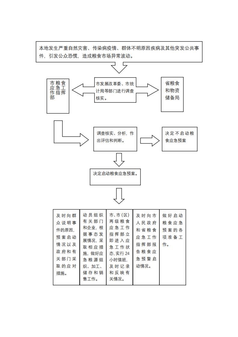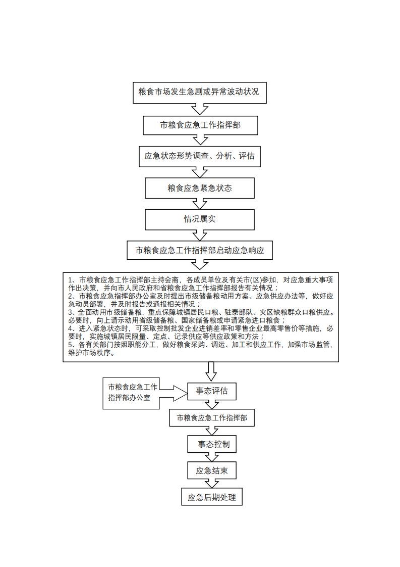 市发展改革委:负责粮食应急日常工作,做好粮食市场调控和供需形势分析;负责应急粮食的采购、加工、调运和销售供应,提出动用市级储备粮,申报动用省、国家储备粮的建议;依法做好粮食收购、储存、运输环节粮食质量安全和原粮卫生的监督管理;负责粮食市场价格的监测监管,必要时按照法定程序依法采取相关价格干预措施;负责组织跨地区电力调度协调,保证粮食加工和调运的优先需要;做好网络舆情应对。